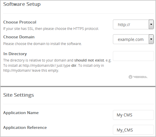 - In Directory: If you want to install this in a directory, for example example.com/directory, enter the directory name. Otherwise, leave this blank to install in your main domain example.com