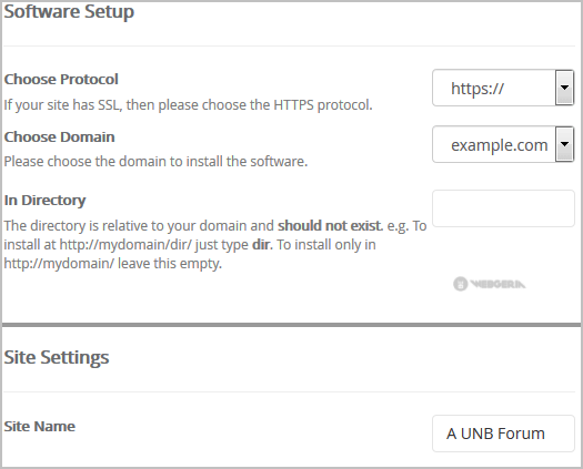 - In Directory: If you want to install this in a directory, for example example.com/forum, enter the directory name. Otherwise, leave this blank to install in your main domain example.com
